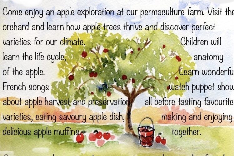 Come enjoy apple trees exploration at our young permaculture farm and orchard. We will visit the orchard, identify apple tress and learn how they thrive. Discover the most delicious apple cultivars that are also cold tolerant and disease resistant varieties for our Canadian climate.
