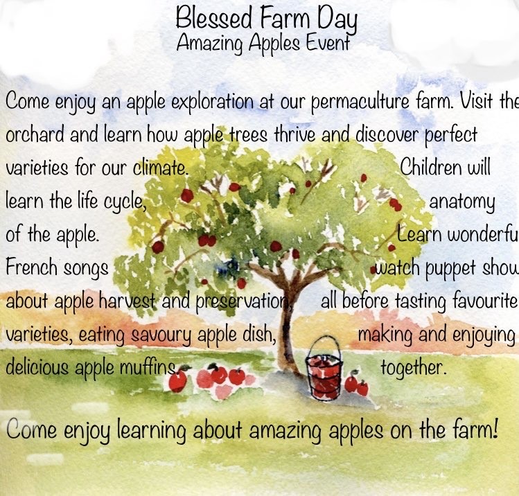 Come enjoy apple trees exploration at our young permaculture farm and orchard. We will visit the orchard, identify apple tress and learn how they thrive. Discover the most delicious apple cultivars that are also cold tolerant and disease resistant varieties for our Canadian climate.